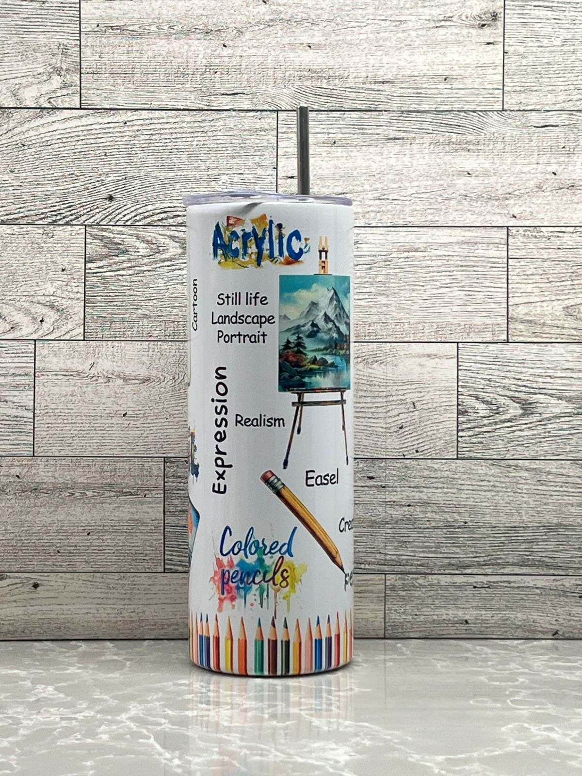 Stay hydrated and caffeinated on-the-go with our 20oz Stainless Steel Tumbler! Featuring a vibrant sublimation wrapped "Art" image, this tumbler keeps your drinks at the perfect temperature while reducing plastic waste with its included metal straw and cleaner. Includes lid and box for convenience.
