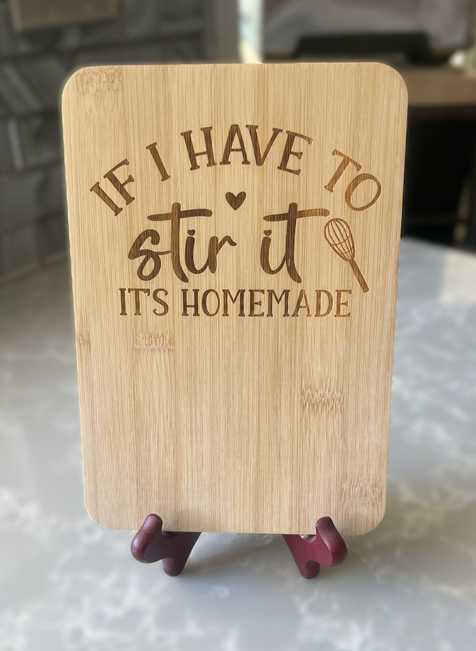 This small etched cutting board is perfect for any cutting needs on the go. It is handcrafted with bamboo and laser etched with custom quotes, making it a one-of-a-kind piece. With dimensions of 8.75" x 6" x 3/8", it is both functional and impressive for entertaining guests.